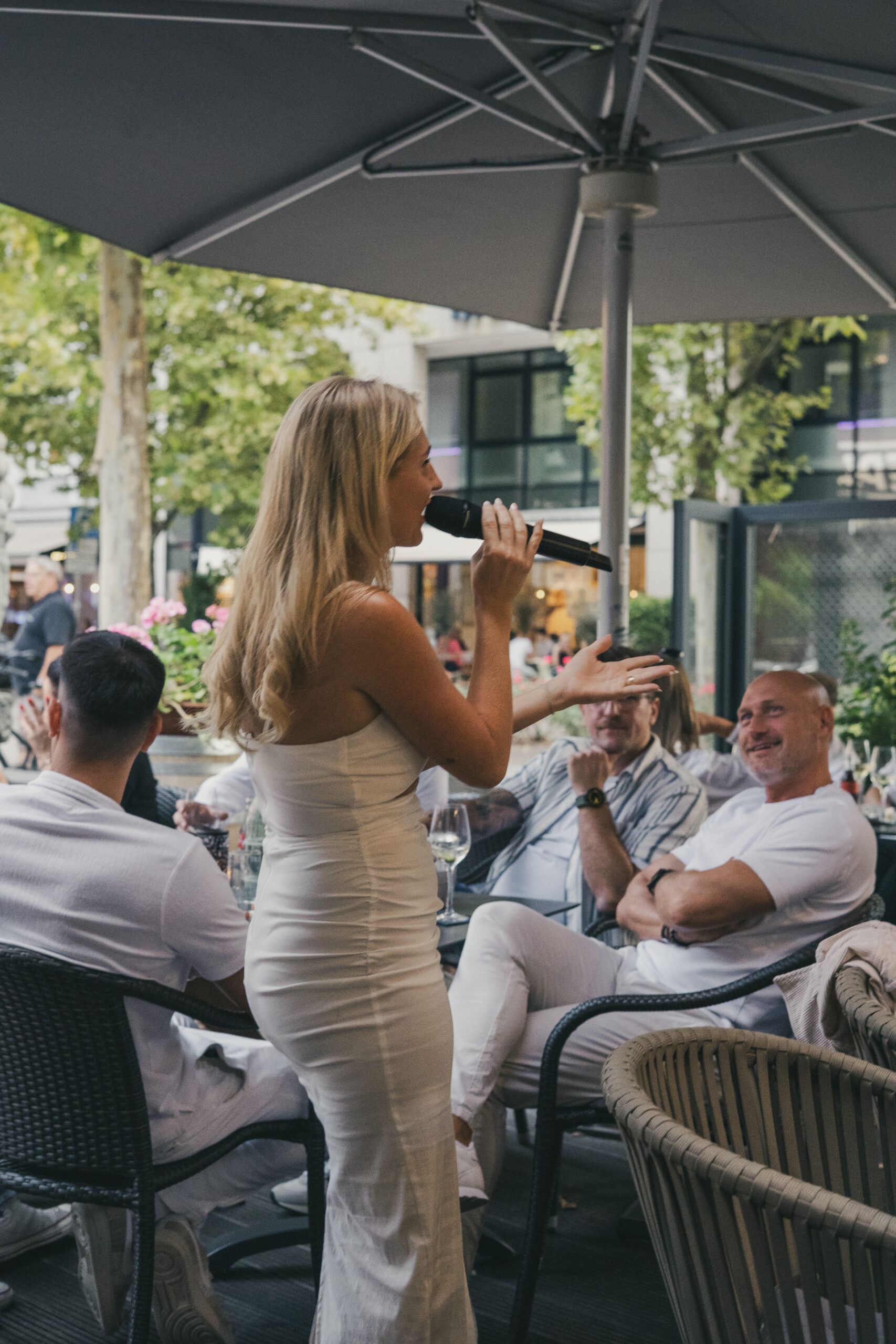 Mit einer breiten Palette an Musikstilen – von Pop und Rock bis hin zu Partyhits und Partyklassikern – biete ich als Sängerin eine riesige Auswahl an Songs für jedes Event. Durch meine jahrelange Erfahrung kann ich nicht nur die passenden Lieder für die Stimmung des Moments auswählen, sondern auch spontan auf Songwünsche und Lieblingslieder eingehen. Genau das ist es, was zählt: eine hochprofessionelle und vielseitige Performance, die sich perfekt an deine Wünsche und die Atmosphäre des Events anpasst.